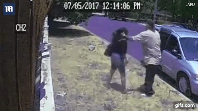 In the video, the man and woman appear to have a brief verbal exchange which escalates. Eventually the woman attempts to walk away; however, the heavyset man grabs her by the hair and shoves her into the light blue Chrysler minivan.