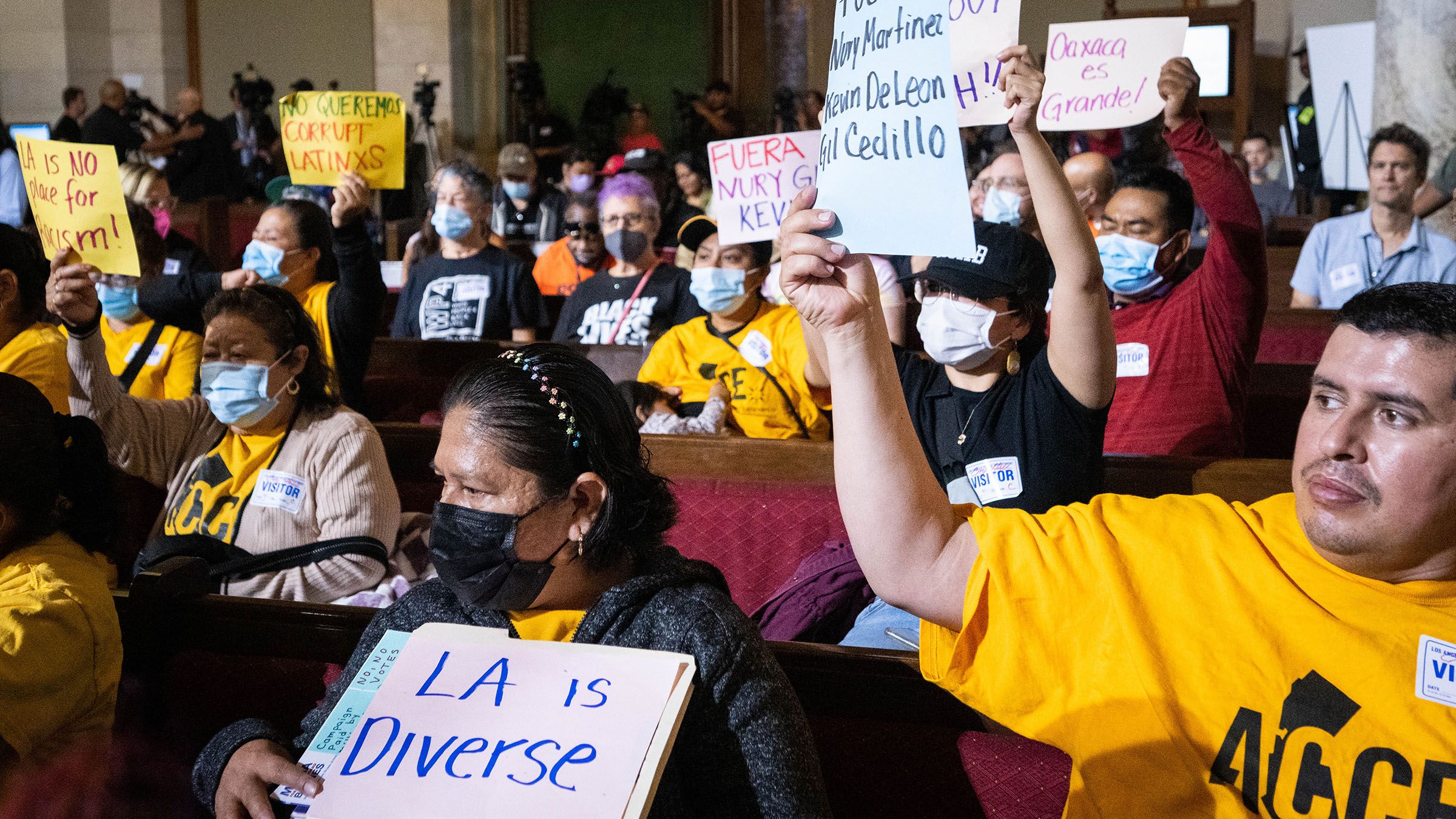 Protesters chanted fuera — “out” in Spanish — using the names of Cedillo, De León and Martinez, and they yelled “shut it down” as council members entered the chamber.