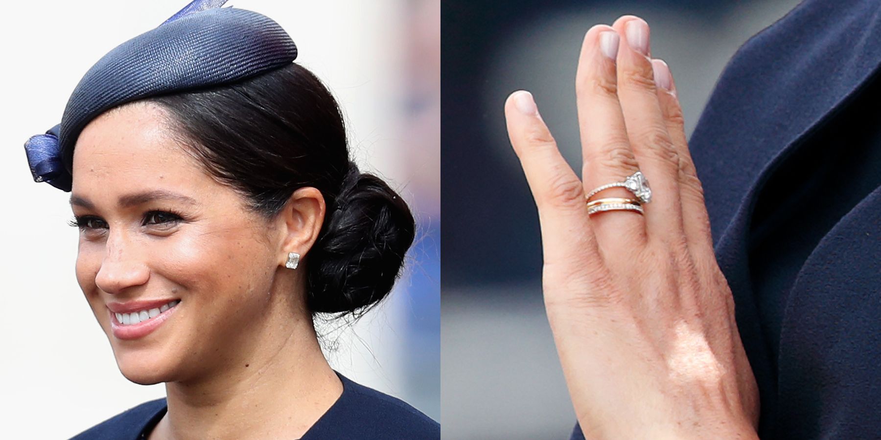 In a truly royal fashion, Prince Harry gifted Duchess Meghan a custom diamond eternity ring with all three of their birthstones. Sapphire for Harry's September birthday, peridot for Meghan in August and emerald to represent baby Archie's May arrival. You aren’t able to see the stones because they are on the underside of the ring, out of view, according to Harper’s Bazaar.