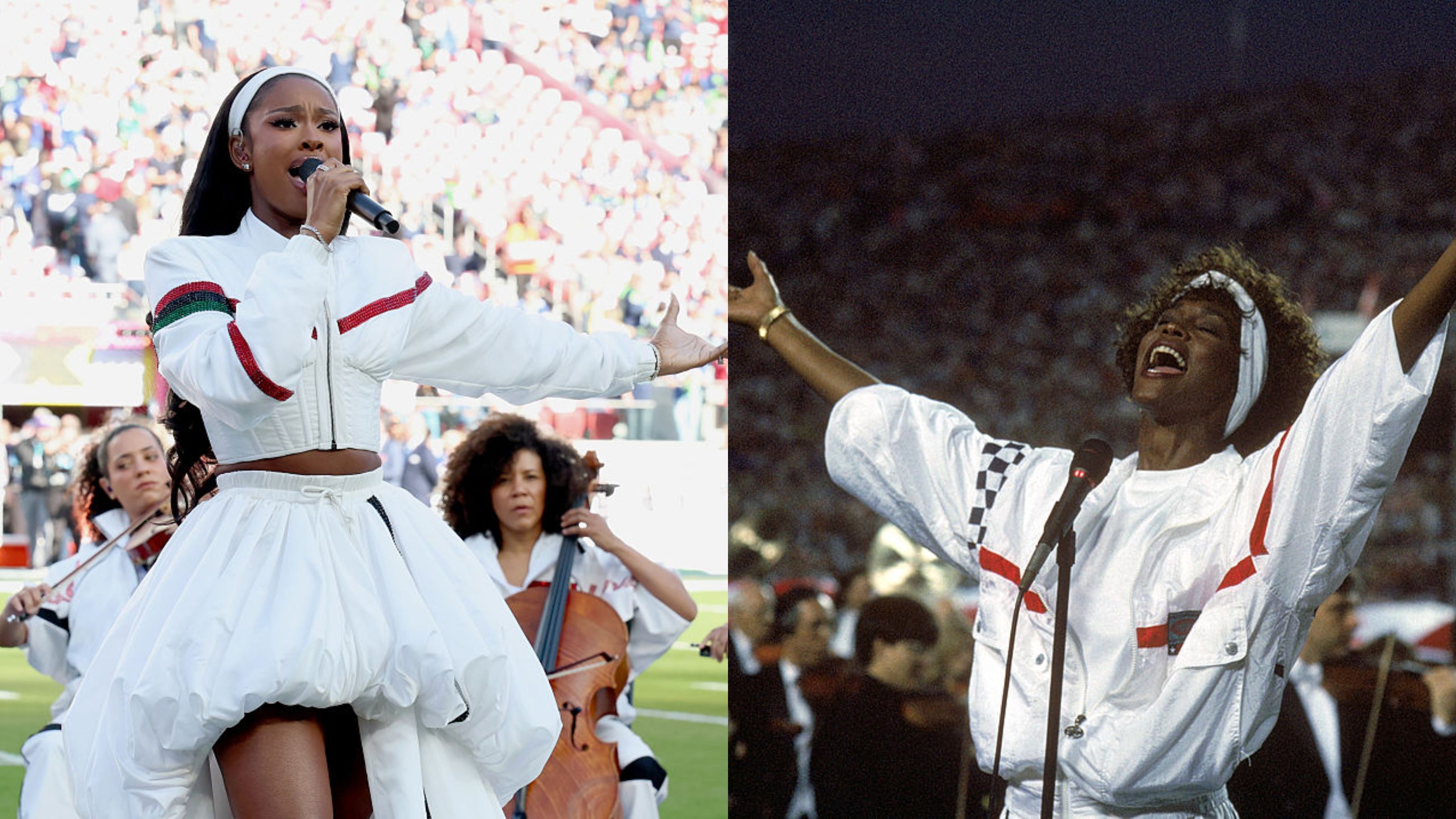 Jones’s all-white outfit was designed with hip-hop fashion legend Karl Kani and was a respectful, creative nod to the way Whitney Houston dressed when she performed “The Star-Spangled Banner” at Super Bowl XXV in 1991.