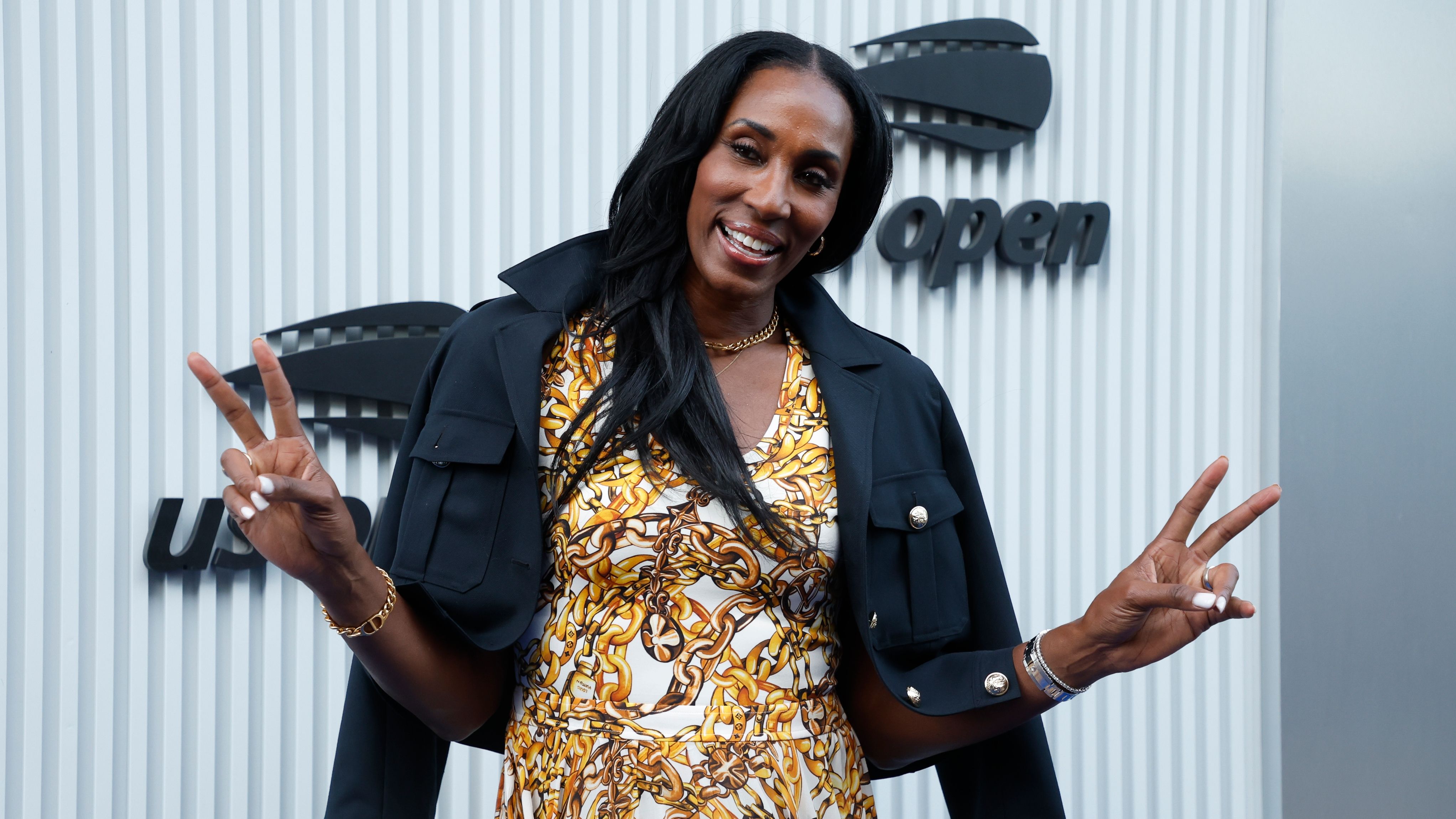 WNBA legend Lisa Leslie was all smiles at this year’s U.S. Open, flashing double peace signs as she posed courtside. Rocking a bold chain-print dress with a chic black jacket draped over her shoulders, the Hall of Famer brought her signature style and charisma to the tennis tournament, proving once again that the Open is as much about star power in the stands as it is about power serves on the court.