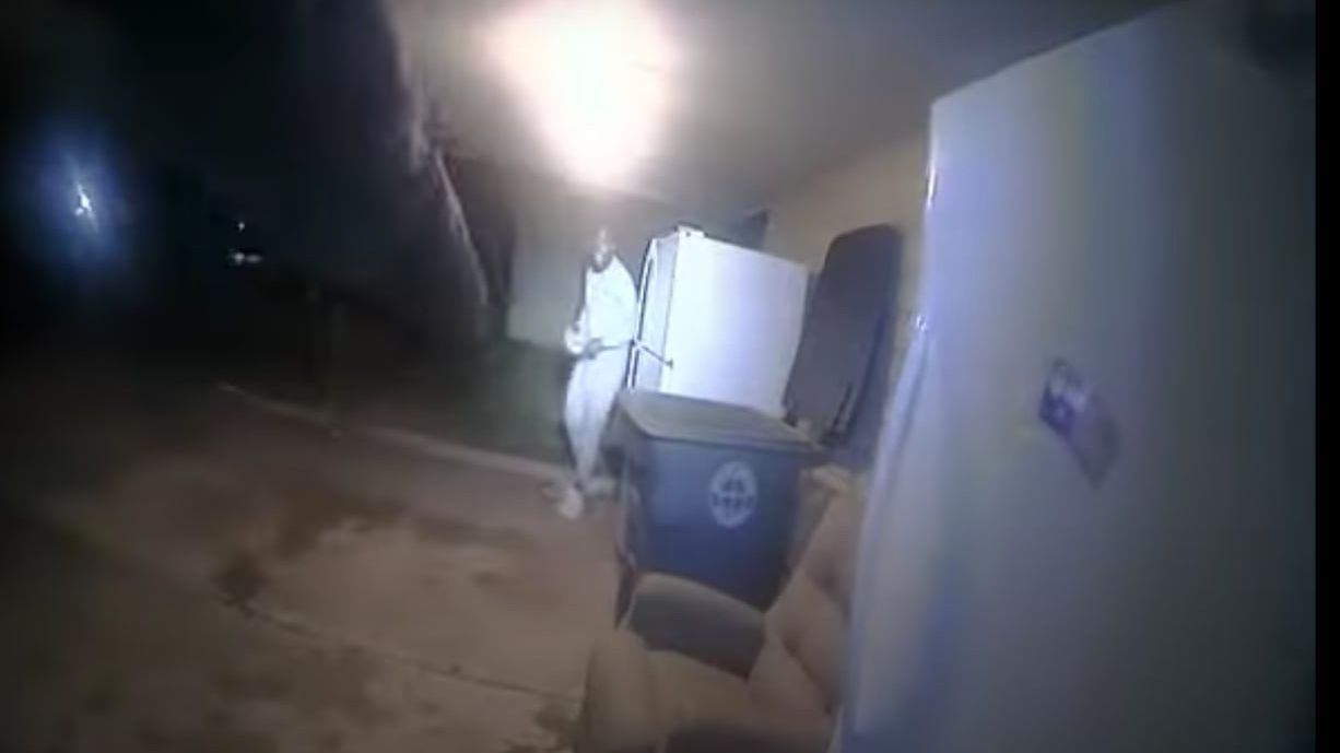 The video shows Sanders appearing from around a refrigerator, his hands visible and holding a baseball cap, which he moved from his right to left hand. Sanders then moved partially behind the refrigerator, but was unarmed the full time.