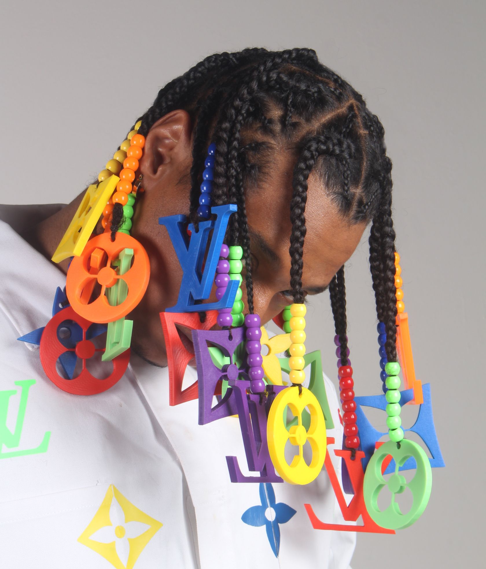 This week, the 27-year-old rapper and graphic designer from Columbus, Ohio took to social media posting a photo series where he modeled a jumpsuit printed with rainbow color Louis Vuitton logos, sporting box braids and matching 3D printed charms at the ends. His caption read, “Hey @virgilabloh can I earn an internship? I have ideas!” And let’s just say, the Twitter-verse went nuts.