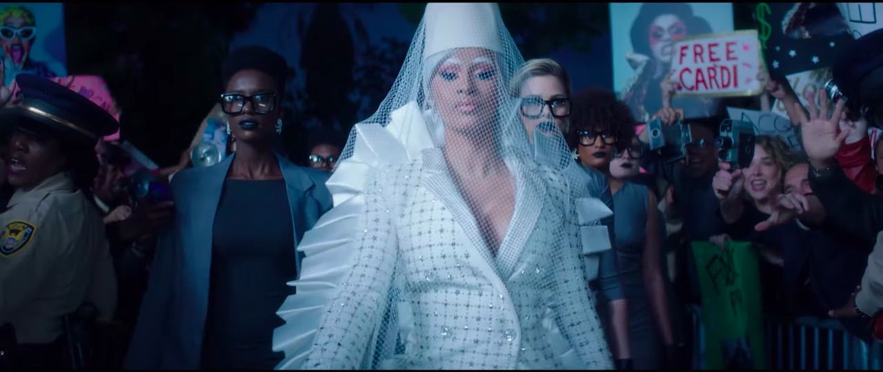 The scene moves to the Afro-Latino rapper holding her own against two police officers as she flirtatiously toys with the increasingly frustrated cops. On the day of her trial, Cardi struts into the courtroom and takes the stand in an all-white Hunger Games-esque ensemble.