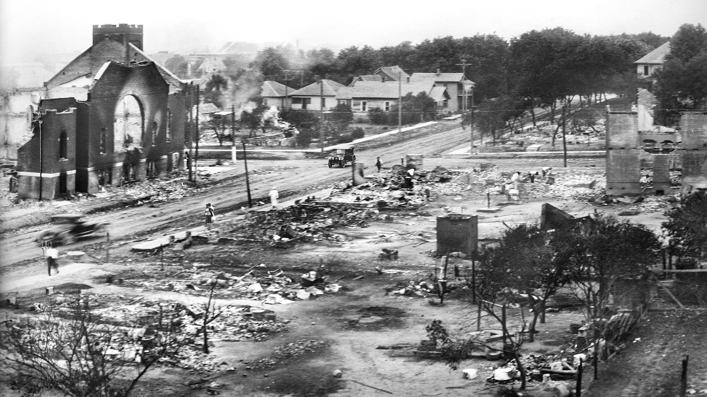 In May 1921, a Black teenager was wrongfully accused of assaulting a white teen girl in an elevator. In reaction, a mob of white supremacists attacked the city’s Greenwood community, also known as Black Wall Street, where a large number of middle class and prosperous African Americans lived. Homes, businesses and churches were burnt to the ground.