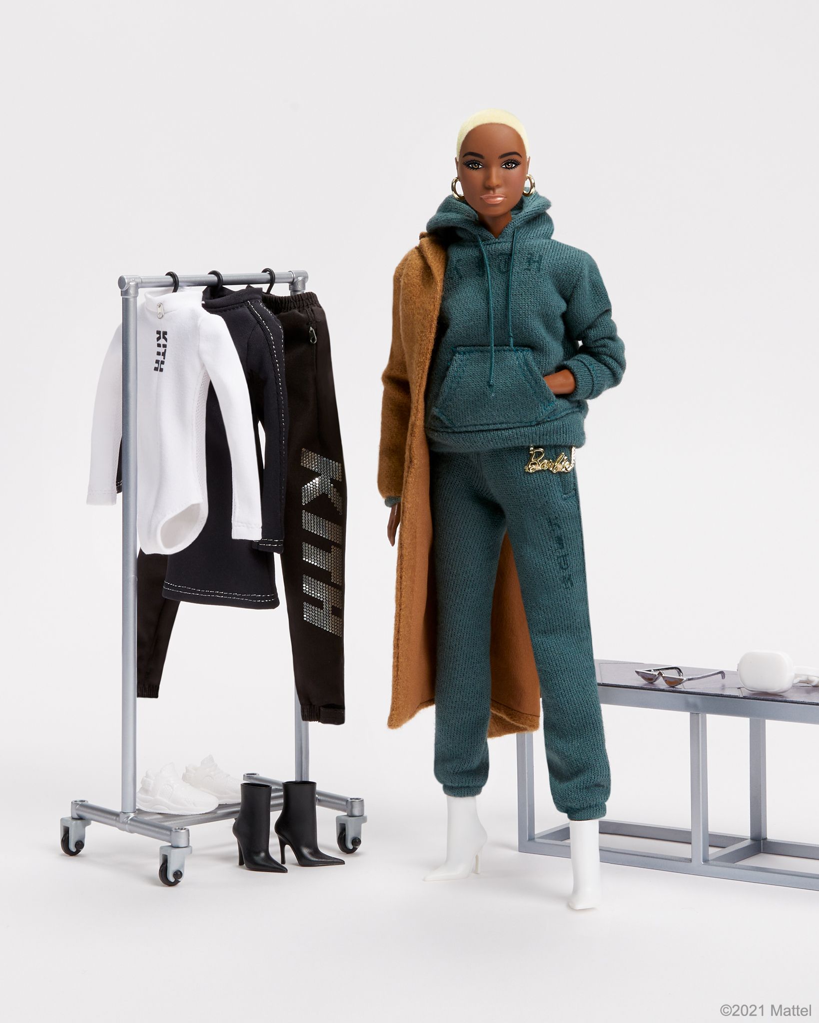 The Kith Barbie doll is dressed in miniaturized Kith Women apparel. In addition to the teal sweatsuit and long coat, she has gold earrings, stylish sunnies, and a rockstar haircut. How fun!