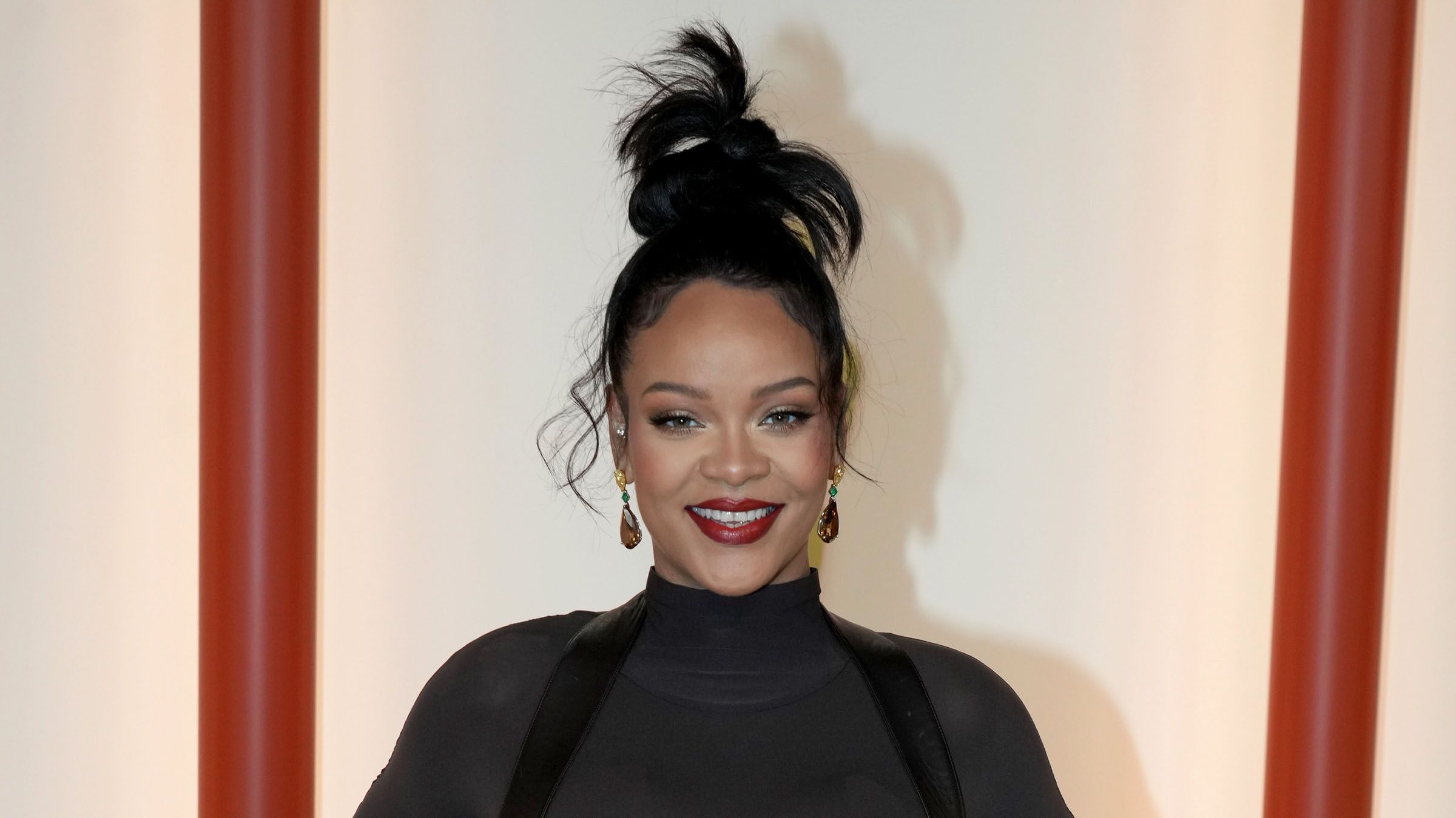 Rihanna revealed that she was expecting her second child during her celebrated halftime performance at Super Bowl LVII. She performed a selection of her hits in a red catsuit and custom breastplate ensemble by Loewe with matching MM6 Maison Margiela X Salomon sneakers.