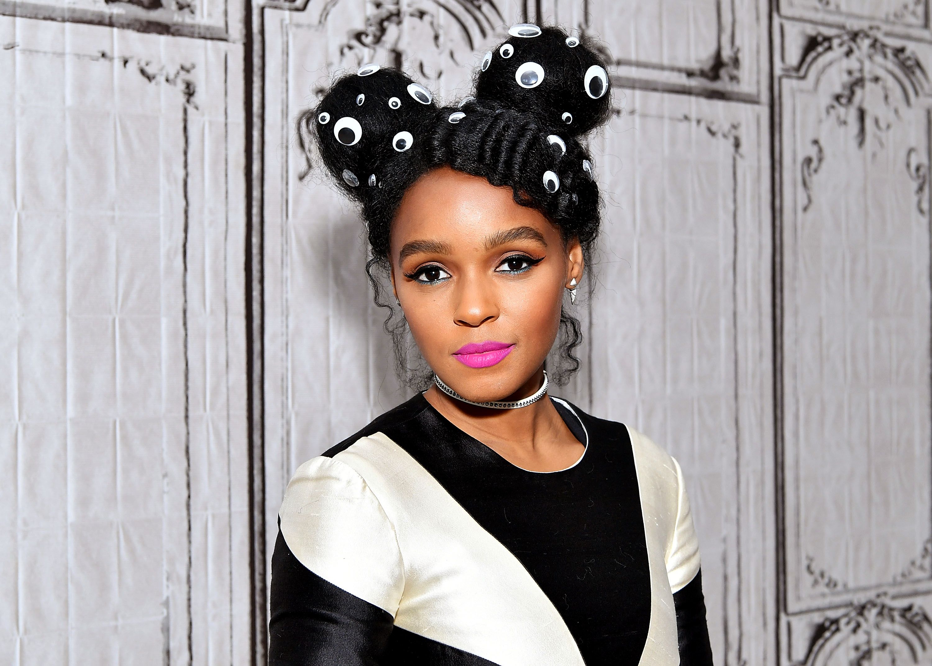 On Tuesday night, Janelle Monáe stopped by The Tonight Show for an interview promoting her new film, Hidden Figures. Monáe is famous for her consistent uniform of all-black and white, and last night she even extended the look to her hair. She covered two buns with those googly eye things you used for arts and crafts in elementary school, and the look is too dope.