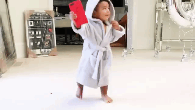 The little one rocked a gray baby plush robe with animal ears while dancing around with an iPhone. Seems like the one-year-old couldn't be any happier for his Dad to age another year.