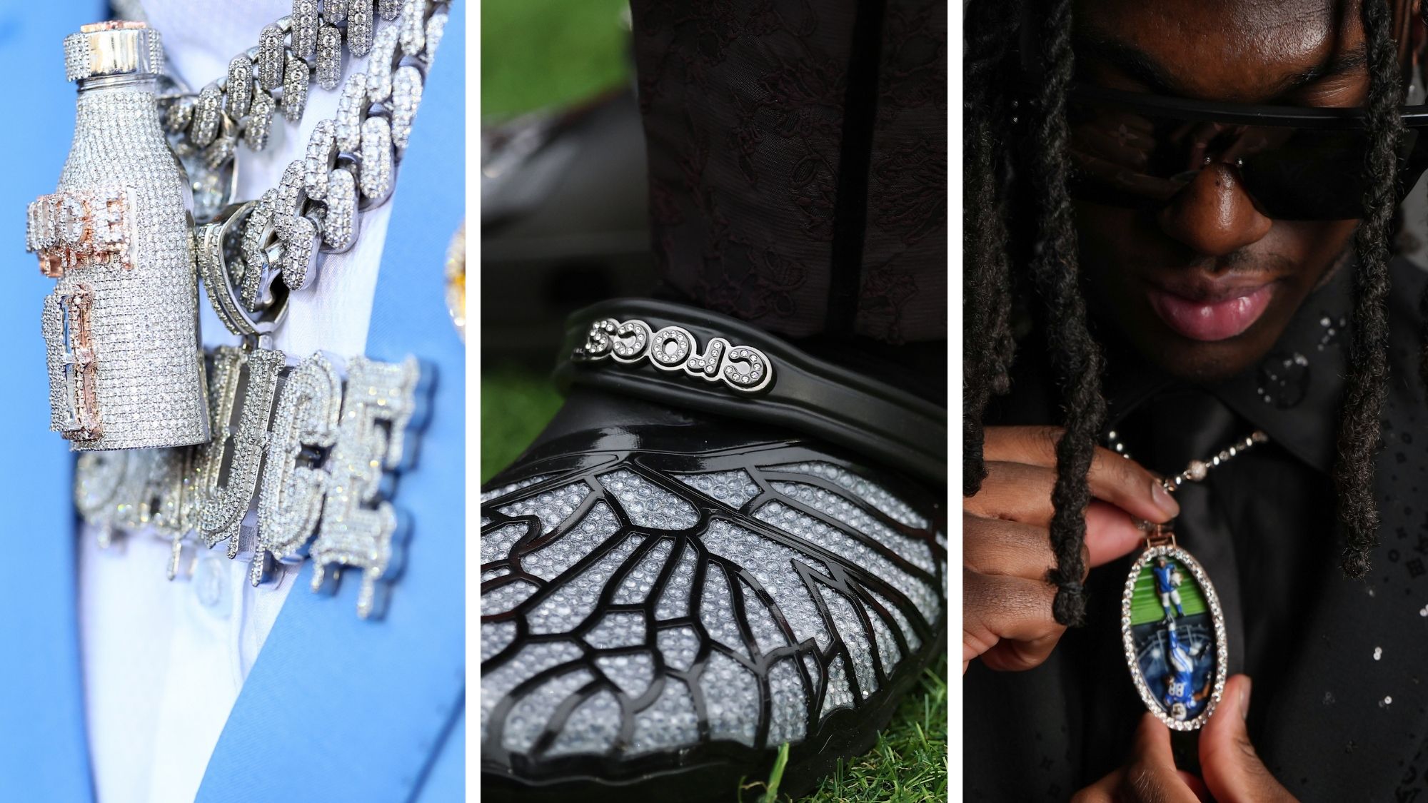 Sauce Gardner literally brought the drip to the red carpet in 2022. He showed up in a powder blue suit accented by a massive diamond-encrusted bottle of sauce hanging from a thick chain around his neck. It was more than just a nickname; it was a whole mood that followed him into his professional career.