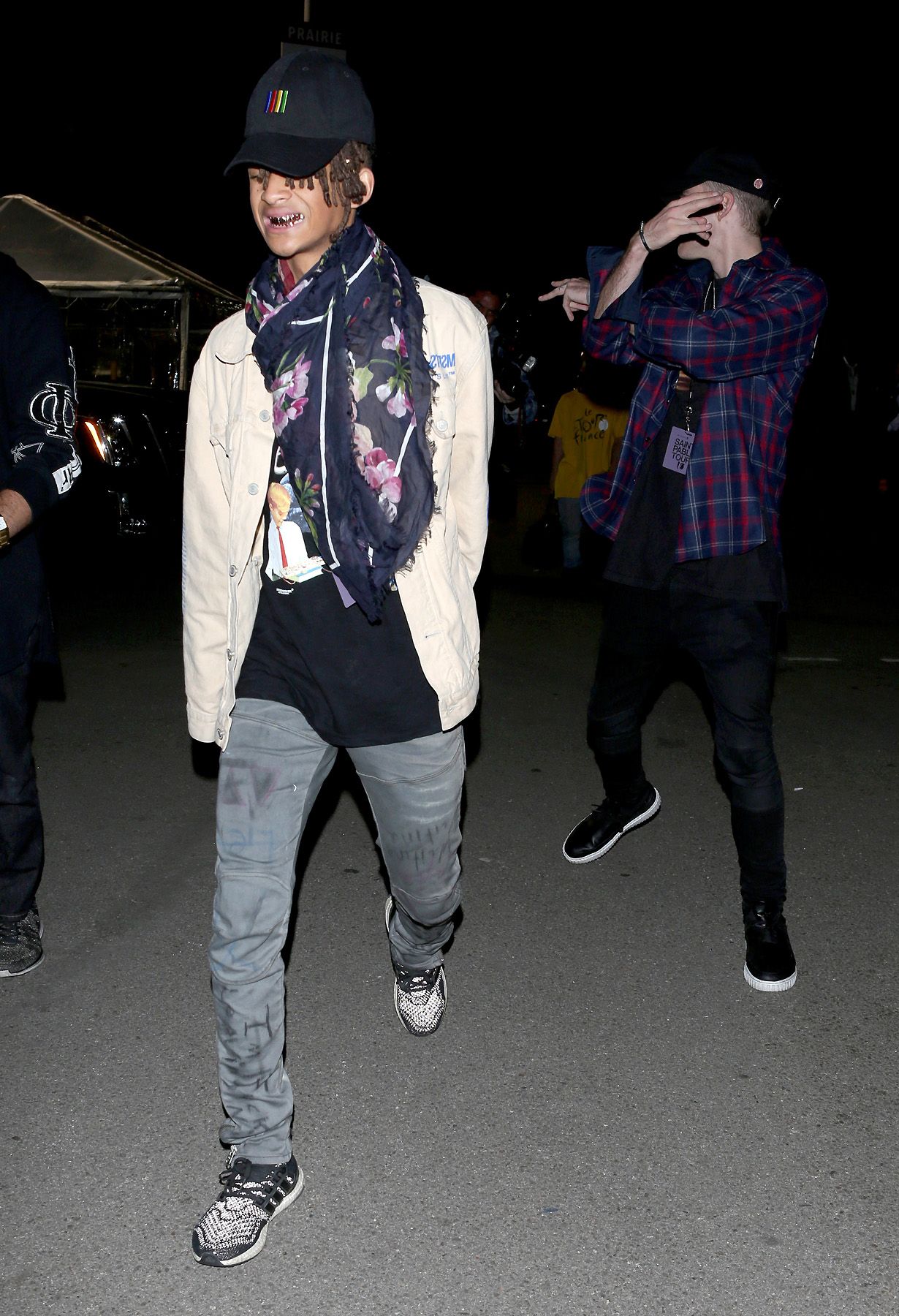 In particular, young J copped his mom's brand-new grills, a gift from him and his sister Willow for the star's 47th birthday just last month. He also wore a floral printed scarf that we can only speculate belongs to Jada to keep warm in the chilly Southern Cali evening. JK, it's most likely from Louis Vuitton, the French luxury house for which Jaden models.