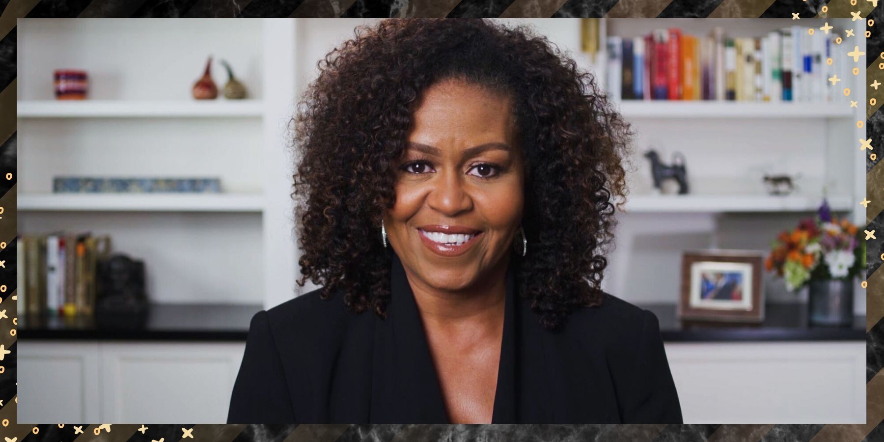 During her virtual appearance, our forever First Lady glowed with her curly tresses on full display. To complete her glam, Mrs. Obama rocked soft makeup and a glossy brown lipgloss. Stunning—as if we expected anything less!