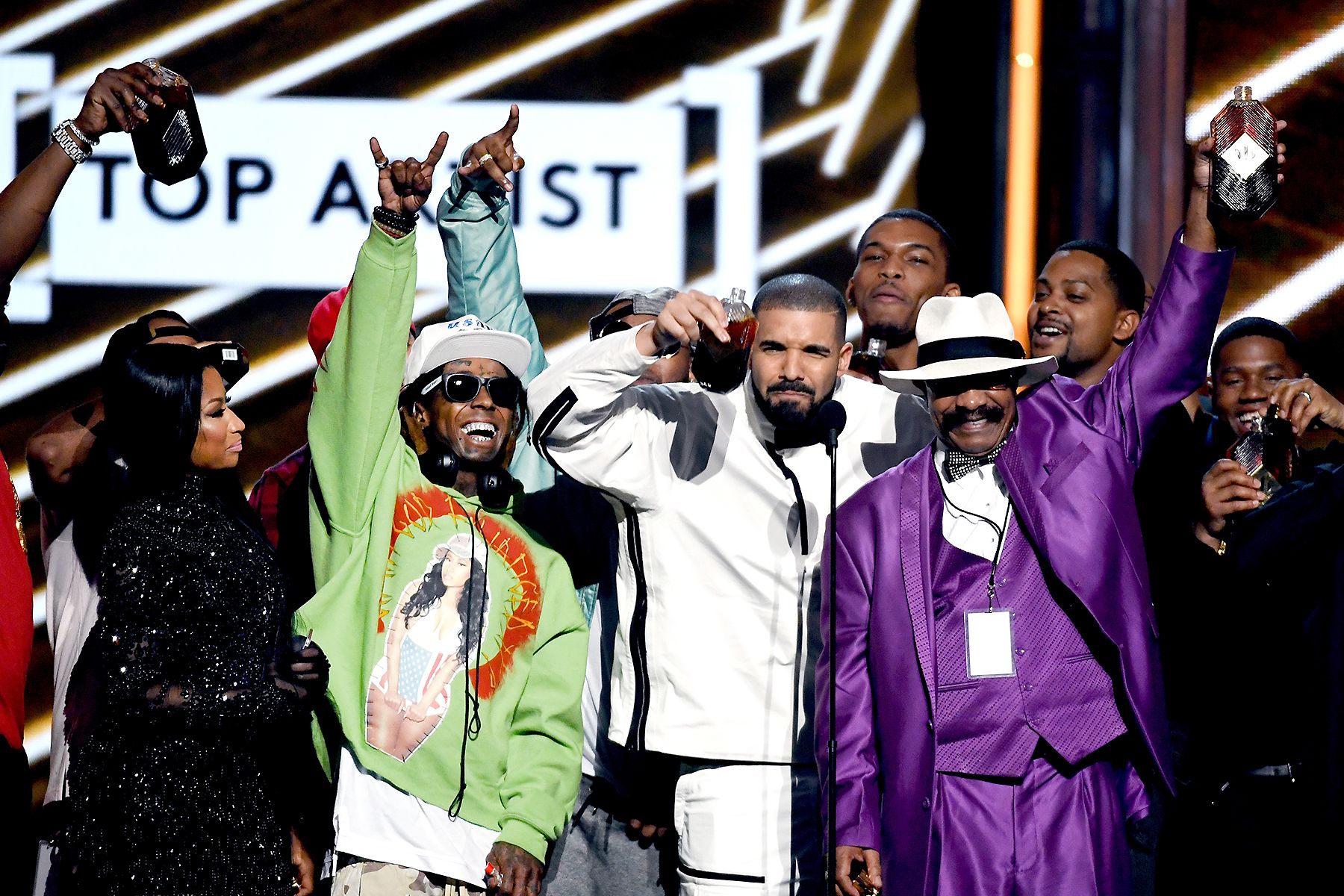 Drake’s 13 trophies at the Billboard Music Awards called for a justifiable celebration, as the Champagne Papi was accompanied by nothing but family on stage: Young Money, OVO and, of course, the bloodline with his dapperly decked-out dad, Dennis Graham.