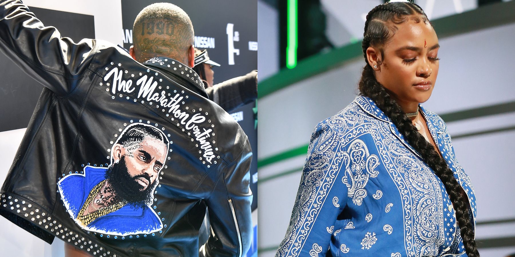 YG walked the BET Awards blue carpet (which was blue in honor of Nip) wearing a custom-made leather jacket with a bedazzled, painted portrait of the rapper’s likeness. Take note to the words: “The Marathon Continues.”