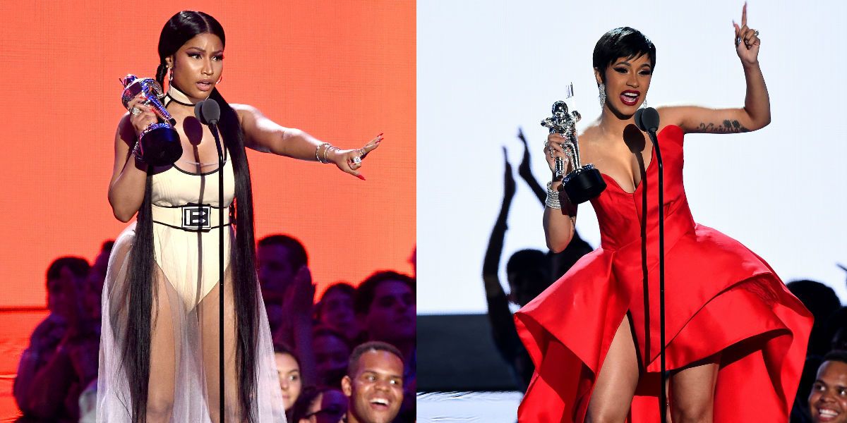 There were a few places this proposed exchange might have taken place too, such as the main stage where Nicki took home the award for Best Hip Hop Video or during her queenly, fan-sweeping, golden affair of a performance. Or, it could have went down when Cardi scored her first solo win of the night with Song of the Summer or during her hilarious troll-mastering speech that opened the awards show. Despite both of them having a fair amount of stage time, the Queen femcee and Bronx breakout star never physically crossed paths. But a few concluding words from Cardi’s acceptance speech after nabbing a moon man for Best New Artist certainly turned heads.