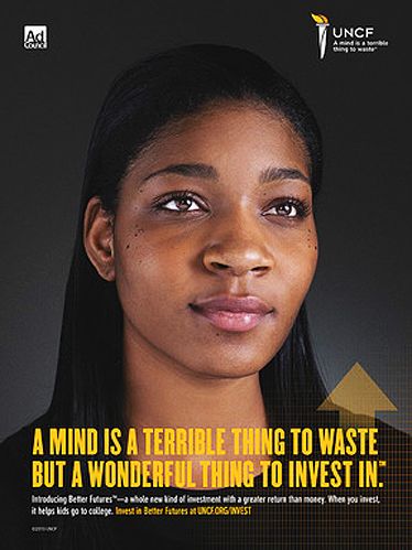 Titled Better Futures, the campaign features such tag lines as "Early Returns Are Promising," "Headed for Historic Gains" and "It's Never Too Early to Invest in a Good Thing." The campaign also expands the original slogan to "A Mind Is a Terrible Thing to Waste, But a Wonderful Thing to Invest In."