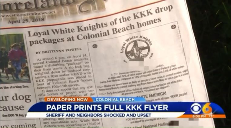 On the front page of the Westmoreland News, a KKK flyer was published in its entirety. Inhabitants of Colonial Beach, which is known as a peaceful beach town, voiced their outrage, reported WTVR.