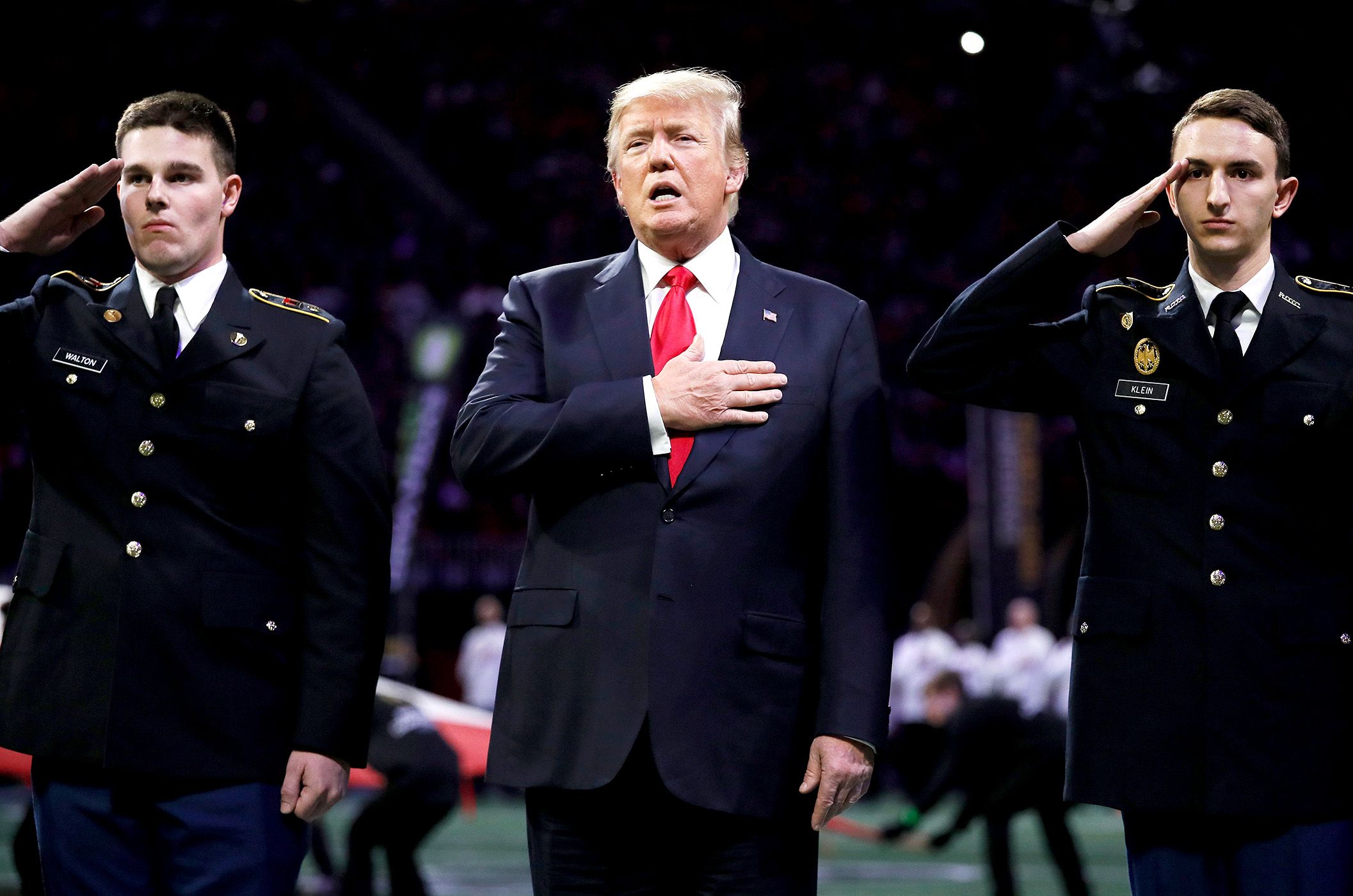 According to Newsweek, the messages "No one is illegal" and "Medicare for all" were also displayed on the stadium via projection with the president in the building. SECCountry.com reported that several local groups organized these efforts in opposition to Trump visiting Atlanta.