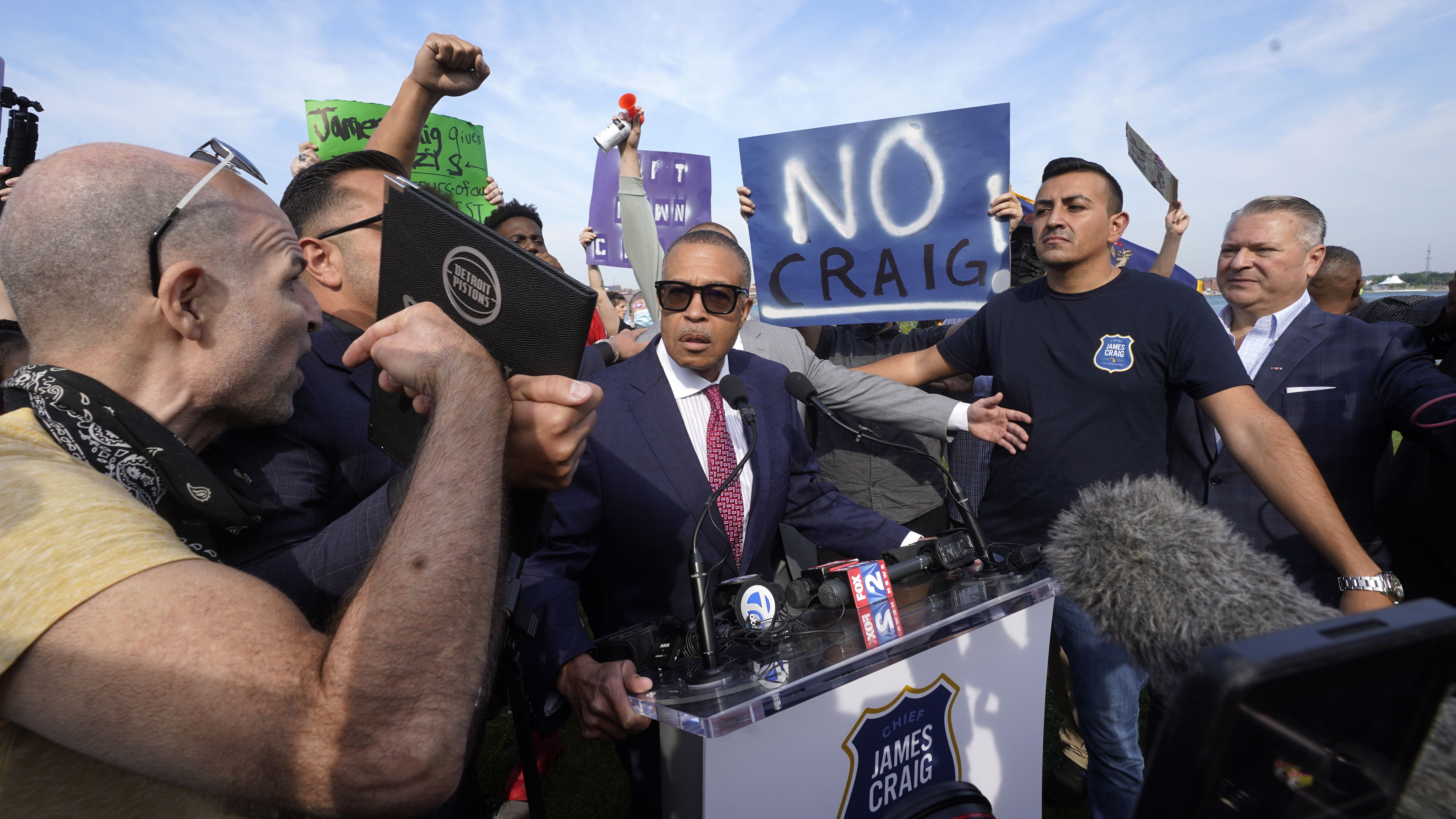 Former Detroit police chief James Craig had his formal announcement for his bid for Michigan’s governorship heavily delayed Tuesday morning (Sept. 14), by protesters angry about the Republican candidate’s bid
