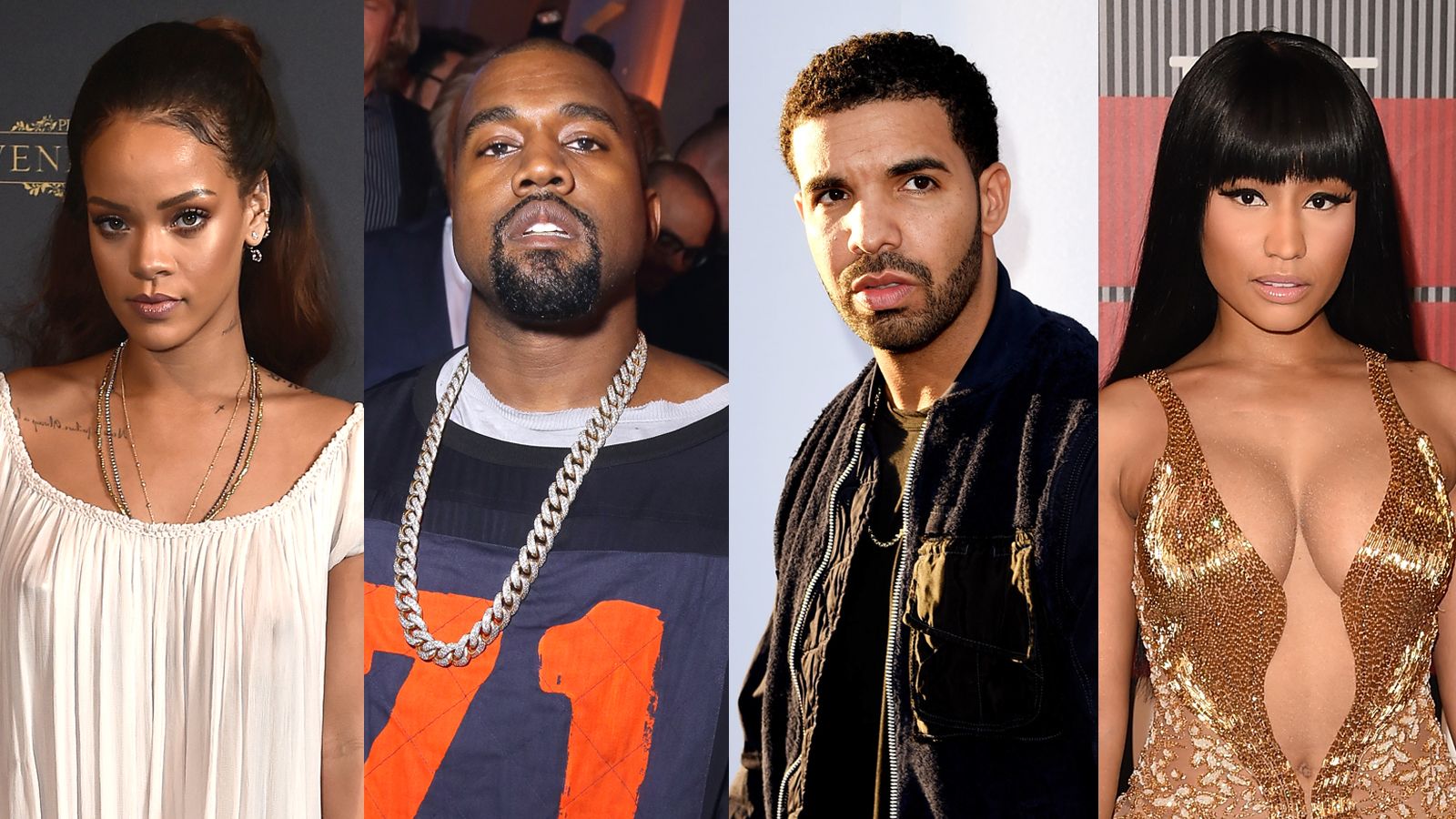 (Photos from top left, clockwise: Pascal Le Segretain/Getty Images for Vogue, Victor Boyko/Getty Images for Vogue, Kevin Winter/Getty Images, Jason Merritt/Getty Images, Aspire / Young Money / Cash Money / Universal Motown, Young Money / Cash Money / Universal Motown, Roc-A-Fella / Def Jam, Maybach Music Group / Slip-n-Slide / Def Jam, Def Jam / SRP)