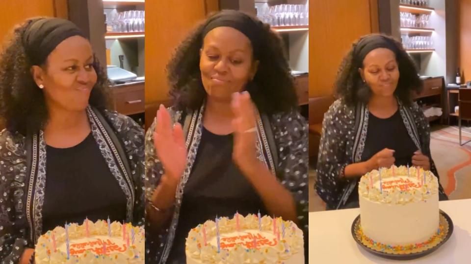 Taking to her social media accounts on Monday (January 17), the forever First Lady posted a video of herself dancing to Stevie Wonder’s “Happy Birthday” in front of a delicious-looking birthday cake, wearing a black headband and rocking a fresh, makeup-free face.