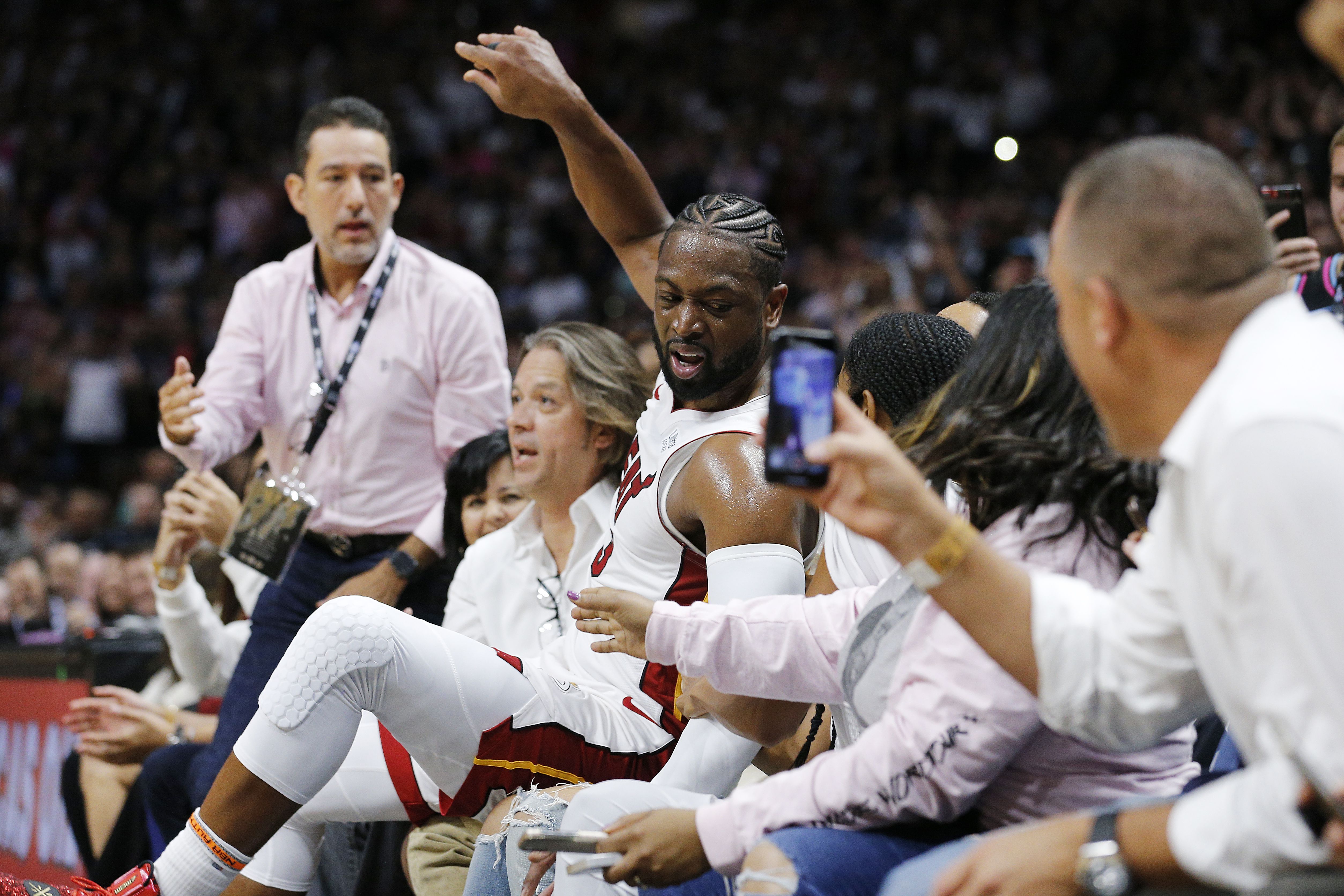 During the Miami Heat game against the Philadelphia 76ers, Wade accidentally crashed into the courtside couple during an extremely epic moment. Luckily, a Miami Herald photographer captured the dramatic tumble.