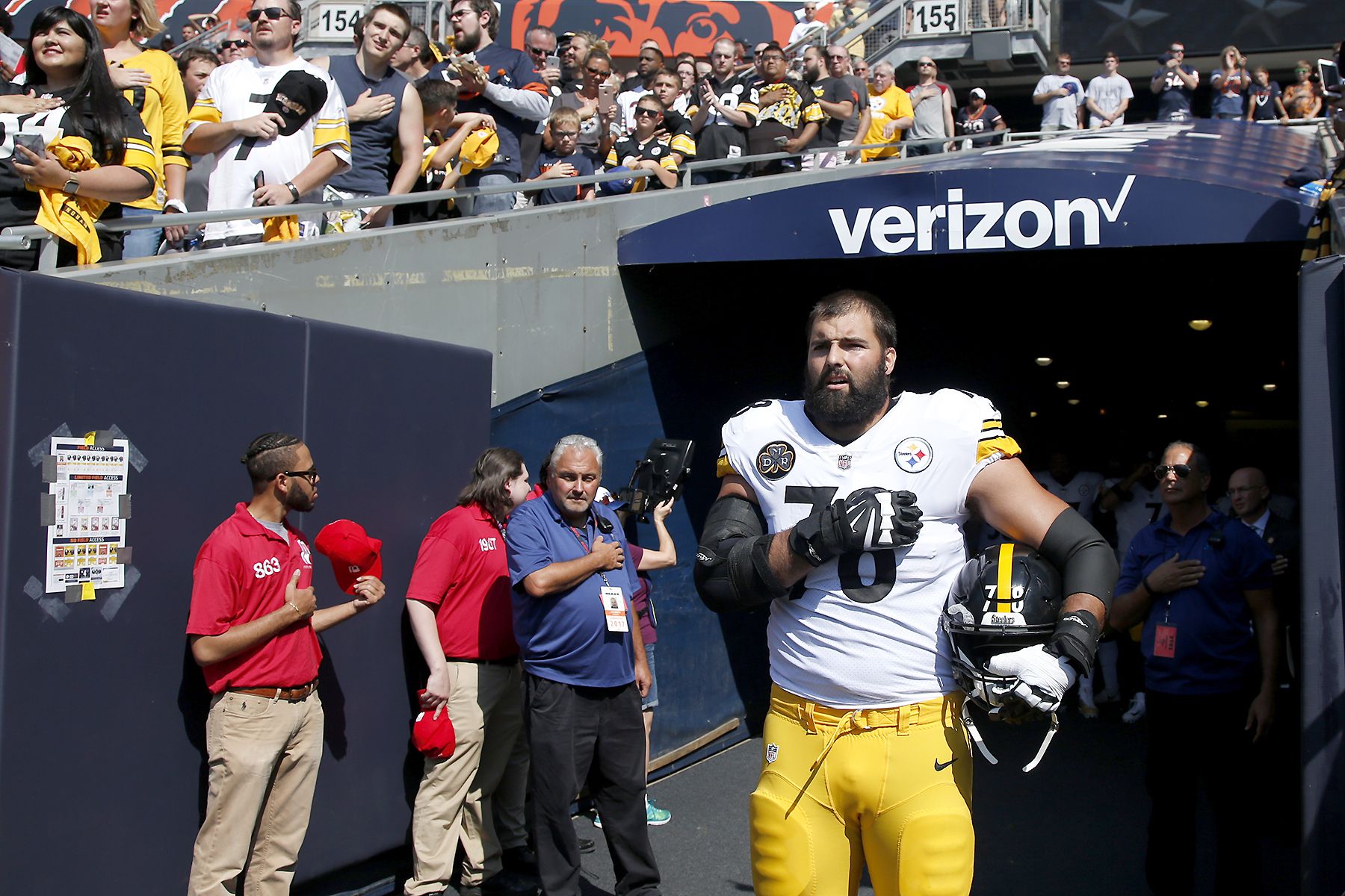The Pittsburgh Steelers remained in the locker room during the national anthem at Soldier Field before kicking off their road game against the Chicago Bears on Sunday.