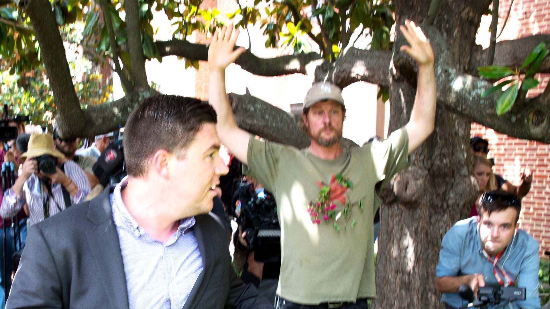 Tyler Magill, 46, who is a DJ for a local radio station and works for the UVA library, joined students on Friday to protest the march and chants by white supremacists. Magill and several students were gathered around the statue of Thomas Jefferson when the supremacists began chanting, “Jews will not replace us.”