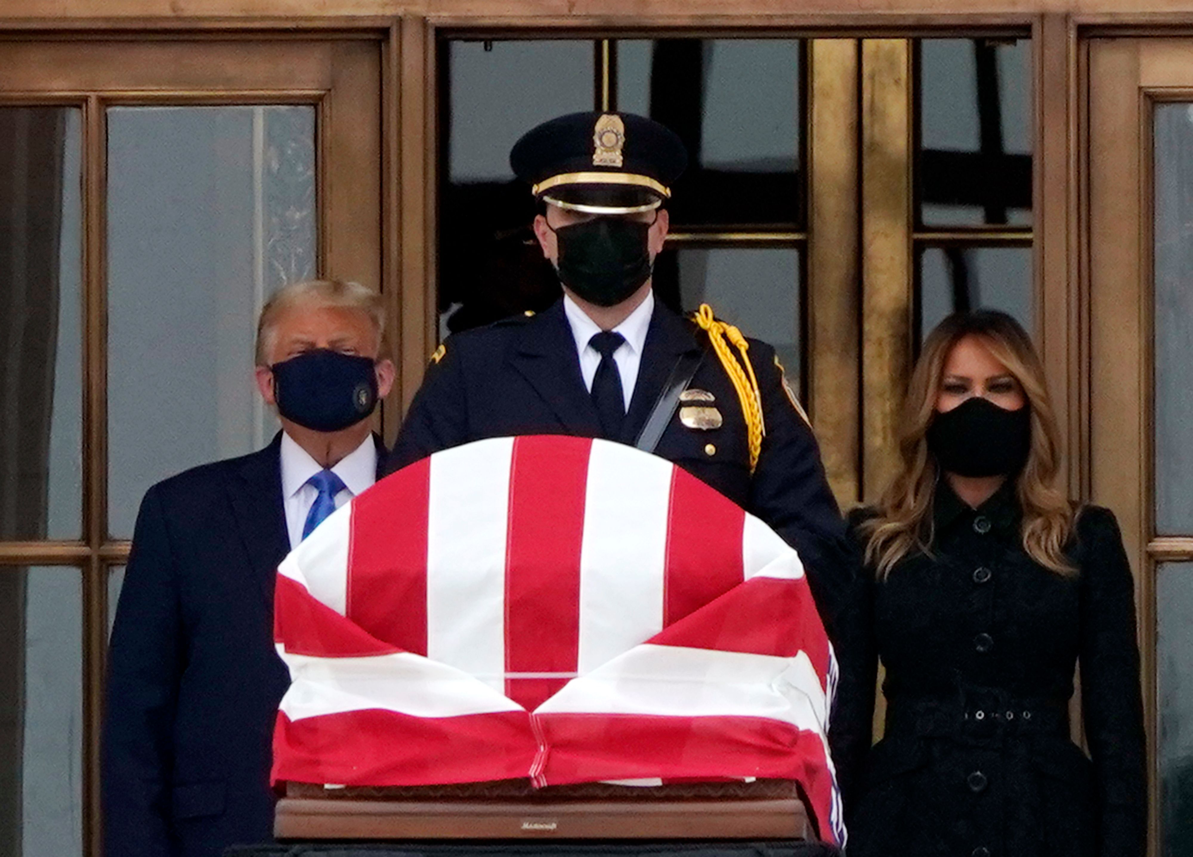 In the clips from the Supreme Court visit, Trump stands silently wearing a mask next to his wife Melania. Bader Ginsberg died due to complications from metastatic pancreas cancer at age 87 last Friday.