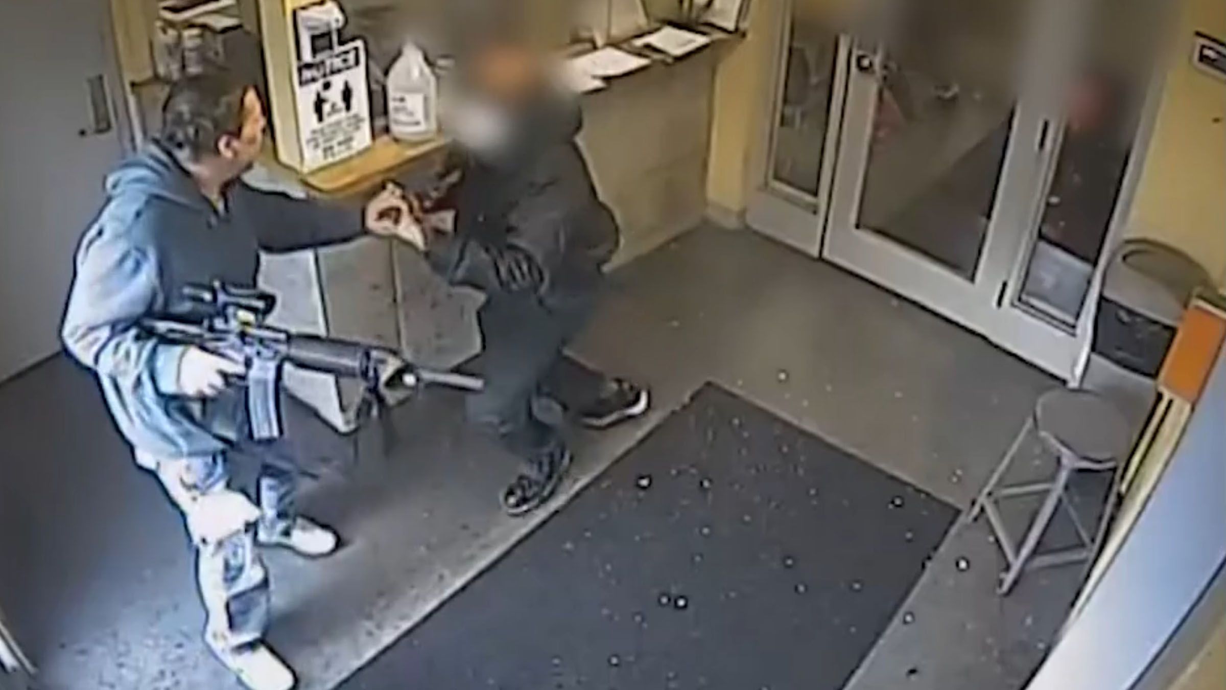 Another guard comes into the frame as the first guard holds the gunman down and assists even as the rifle is discharged two more times. Fortunately, no one was injured.