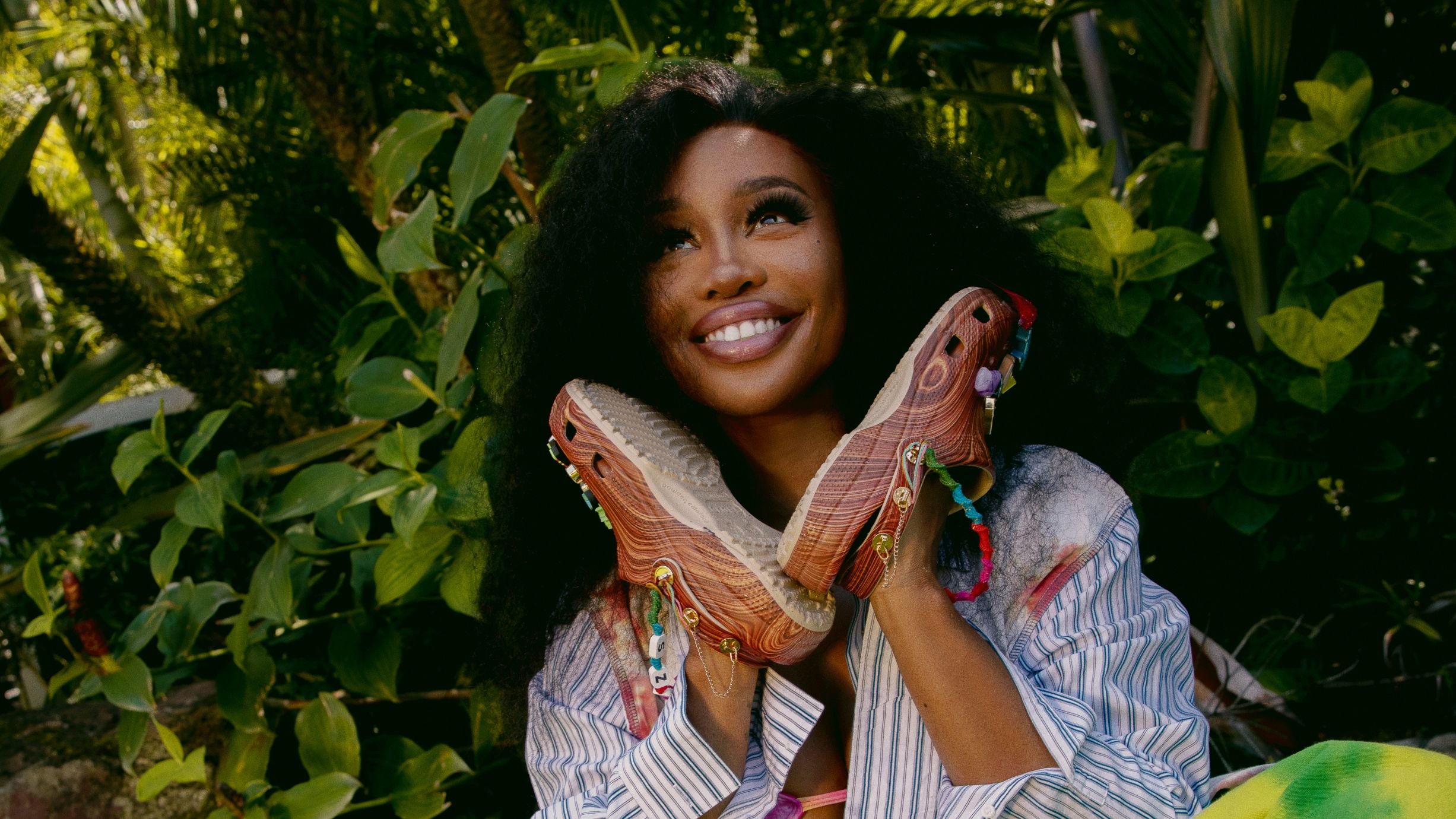 The collaboration features two limited-edition shoes, iterations of the Crocs Classic Clog ($70) and Crocs Classic Slide ($40). The style features a warm woodgrain pattern and colorful custom Jibbitz™ charms that showcases SZA's personality. They represent totems that keep her grounded, calm, and collected.