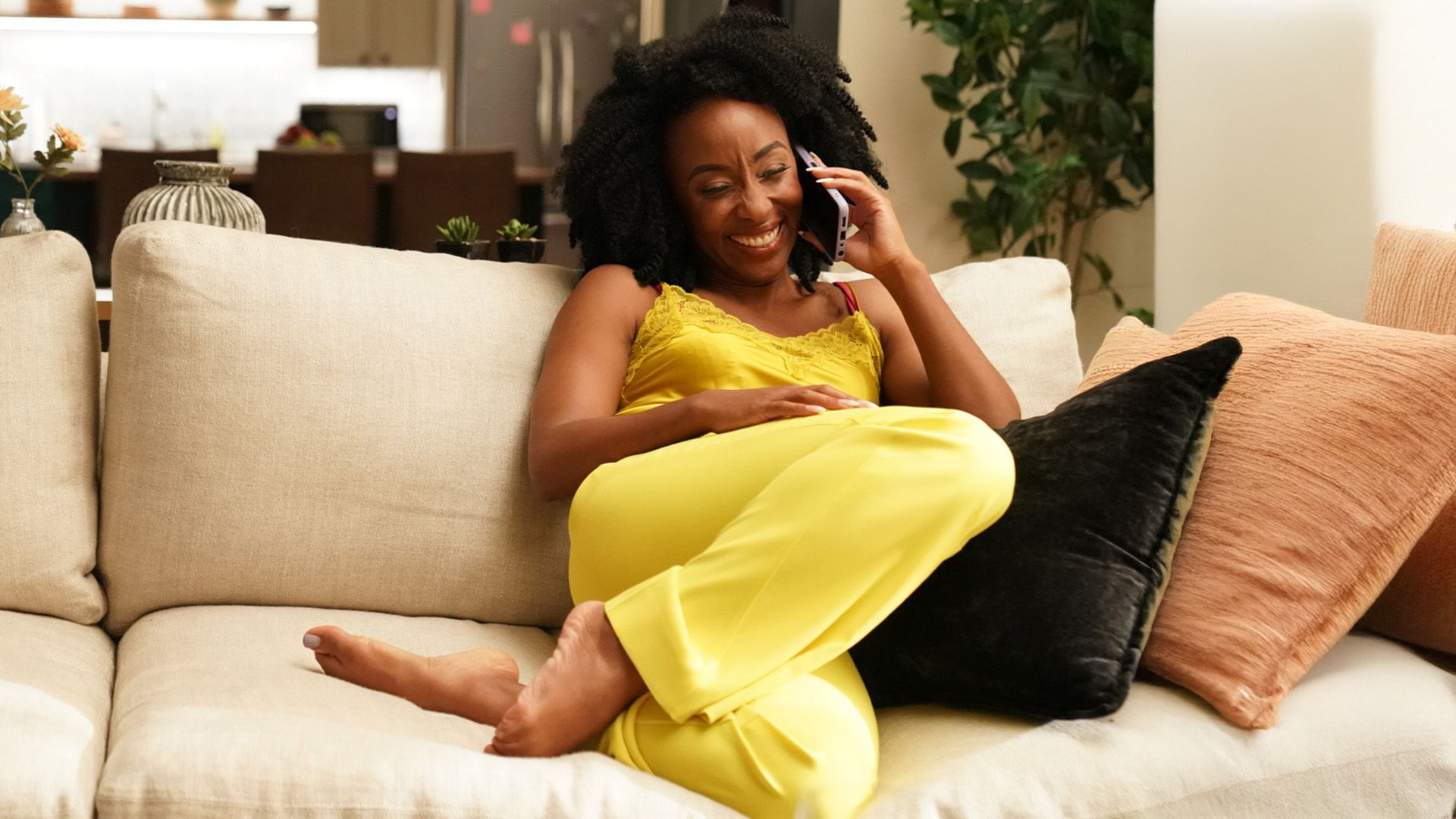 She’s rocking a vibrant yellow satin camisole-and-pants set with lace trim. It’s soft, luxurious, and makes a serious case for dressing up your downtime.