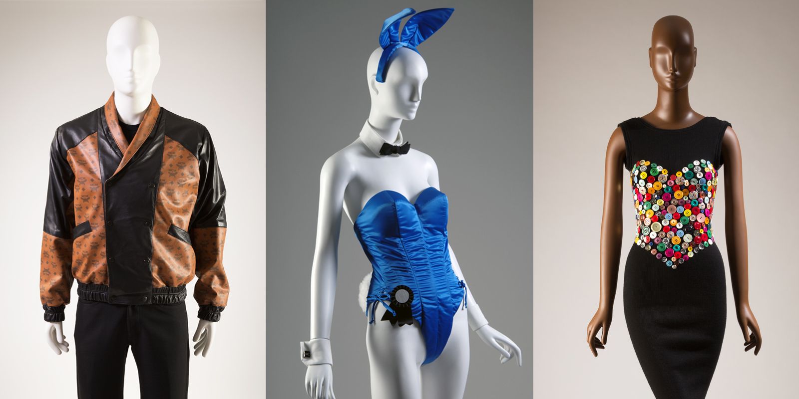 Dapper Dan was somebody that we really wanted to showcase in our collection and also in a museum setting, because I think it’s a bit nontraditional to have something from him in a museum setting. So we’re quite pleased that we’re one of the only museums to have a piece by Dapper Dan in our collection, and we love the way that he reinterprets the style. He uses luxury logos but then creates these really, really outrageous silhouettes, but really using fashion history. If you look at the logo button sleeves that he’s done, and he has these wonderful stories about how someone would bring in a Louis Vuitton bag and say, “I want a whole Louis Vuitton ensemble.” So I think really playing into the culture and the personalities of a lot of his clientele, and taking inspiration from a lot of people on the streets, from the B-boys, the B-girls performing, and then bringing that into fashion. What I find fascinating is the collaboration between Louis Vuitton and Supreme, that originally Dapper Dan had gotten in trouble by Louis Vuitton and now you see them collaborating with a street style brand. It’s interesting to kind of see how the tables have turned. — Ariele Elia