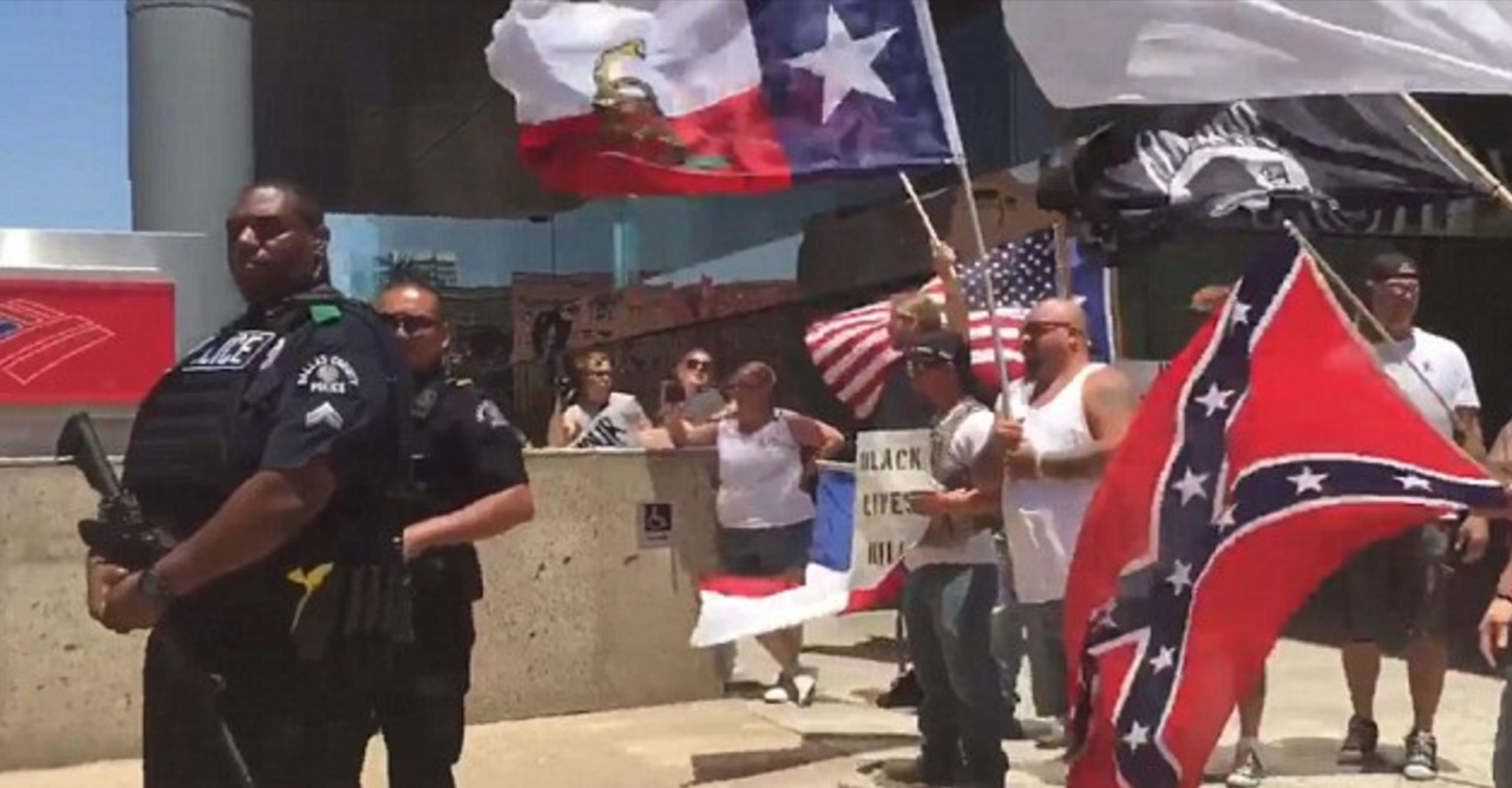 After the tragic ambush in Baton Rouge that left three officers dead and three officers injured, white confederate groups took to the streets in Dallas. A large rally took place on Sunday, wherein protesters waved Confederate flags and held signs that read “White Lives Matter” and “Black Lives Kill.” The worst part of it all: the rally was protected by at least one Black police officer.