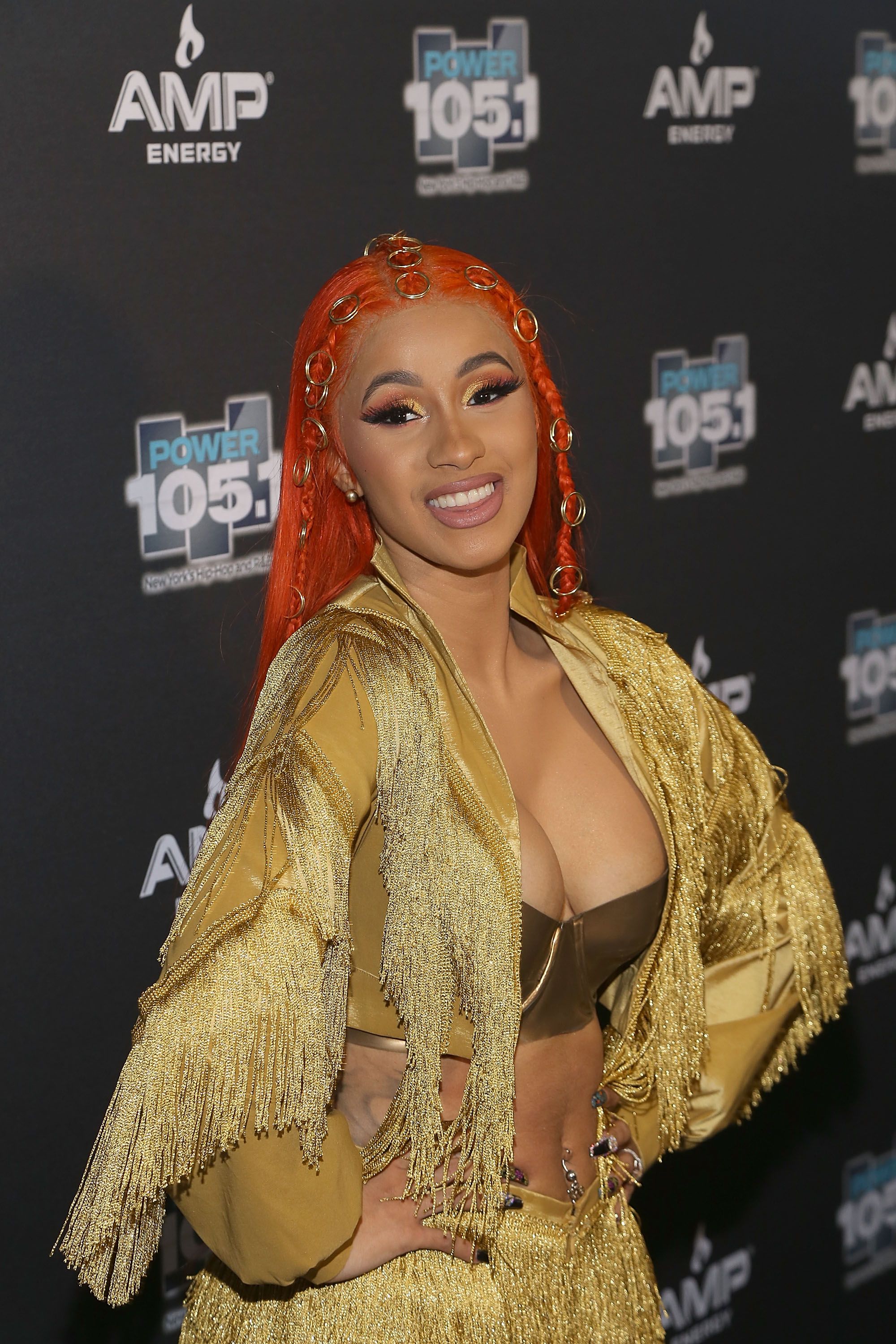 Cardi and her dancers got in formation wearing gold sets while performing her new single, “Money Bag.” Bardi is seen wearing a gold strapless bra with a fringe mini skirt and a matching cropped jacket.
