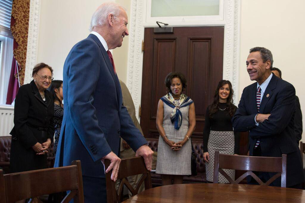 Joe Biden greets Mel Watt and family before swearing-in.